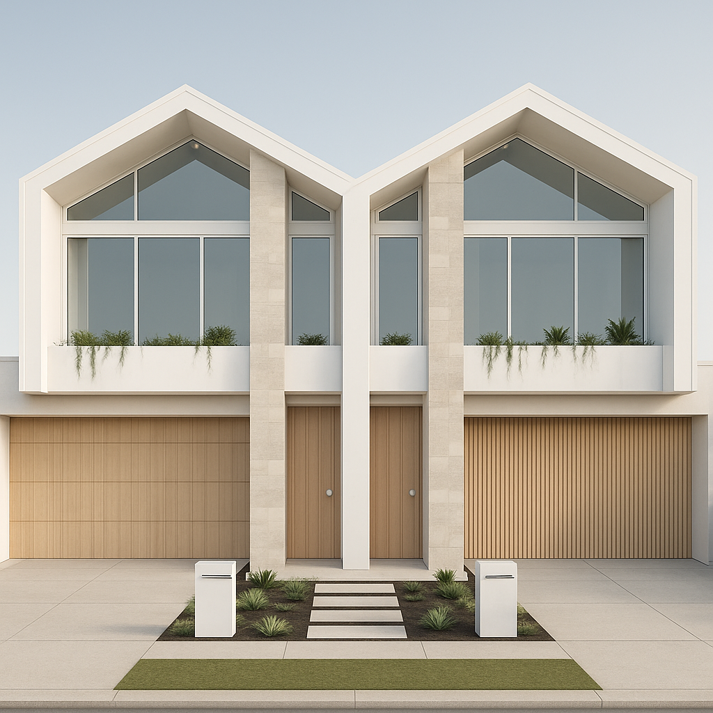 The façade is defined by clean gabled forms, crisp white cladding, and soft natural stone elements that introduce texture and depth. Vertical proportions and recessed upper balconies create shadow and articulation, while timber garage doors and entry accents add warmth against the light palette. This layered approach reflects a growing design trend toward blending coastal softness with architectural clarity, avoiding ornamentation in favour of considered detailing and material honesty.